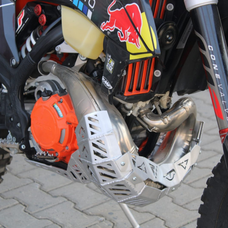 The Pipe Protected Impact Plate is an essential addition to your motorcycle if you're looking for maximum protection and style. This product surrounds the entire exhaust and crankcase, preventing damage to your engine in case of impacts or collisions. With its innovative design, mud and small stones that can accumulate in the exhaust - crankcase easily flow/drop, ensuring that your engine runs smoothly. Its aluminum construction not only offers minimum weight but also provides maximum protection, enhancing the durability of your bike. This product offers the flexibility to express your style on the catwalks with its special colors and patterns. Upgrade your motorcycle with the Mitigator Pipe Protected Impact Plate and enjoy worry-free rides on any terrain.